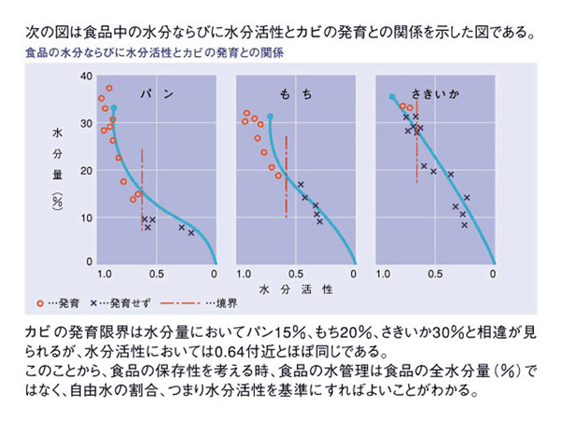自由水… 環境や温度湿度の変化で容易に移動や蒸発がおこる水。微生物が繁殖に利用できる水。